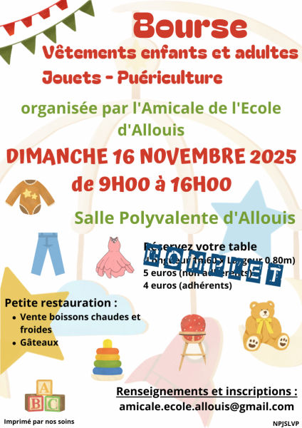 L’Amicale de l'école d' ALLOUIS organise sa 10ème Bourse aux Vêtements enfants et adultes, jouets et matériel de puériculture à la Salle Polyvalente d'ALLOUIS.